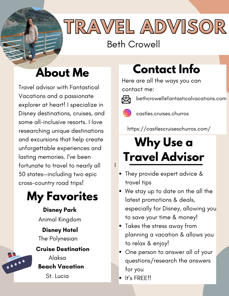 - One person to answer all of your questions/research the answers for you. If you have any questions regarding your trip do not hesitate to reach out to me, if I do not know the answer I will research it for you. Being part of a larger travel agency, Fantastical Vacations, allows me to also utilize other agents and pick their brains for tips & tricks too.